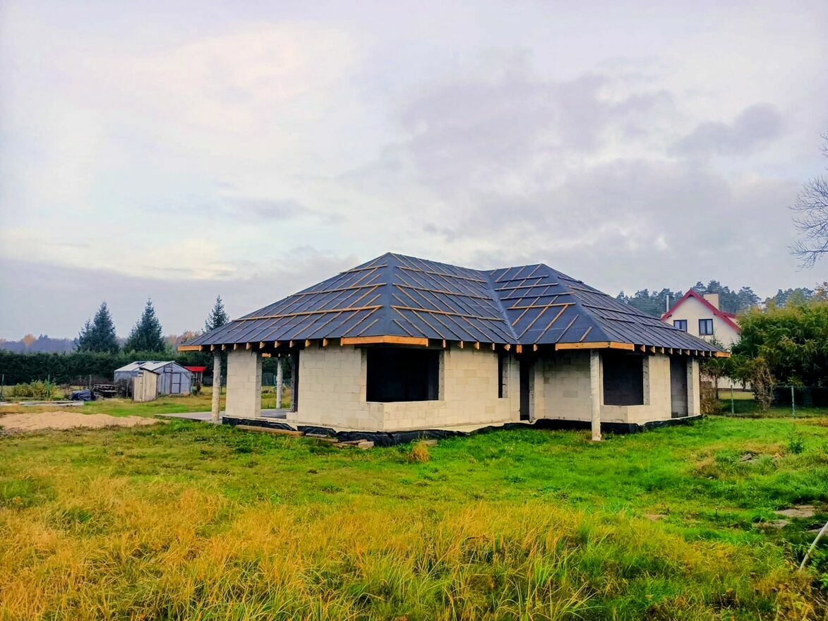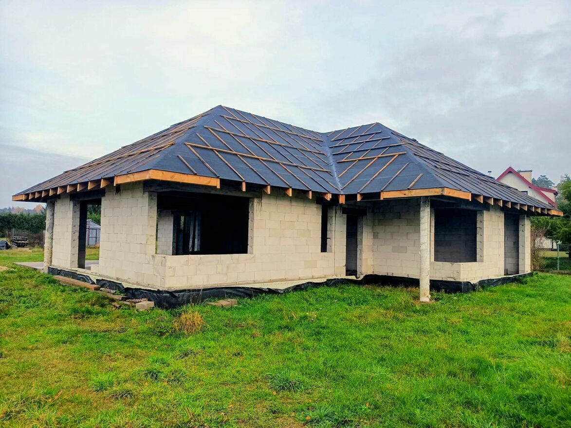 Fundamenty ławy z betonu, ściany fundamentowe z betonu ocielnone styropianem ekstrudowanym gr 12cm, nadproża żelbetowe prefabrykowane, strop drewniany belkowy, ściany zewnętrzne i wewnętrzne: siporeks ( beton komórkowy ). nachylenie połaci 35 stopni.