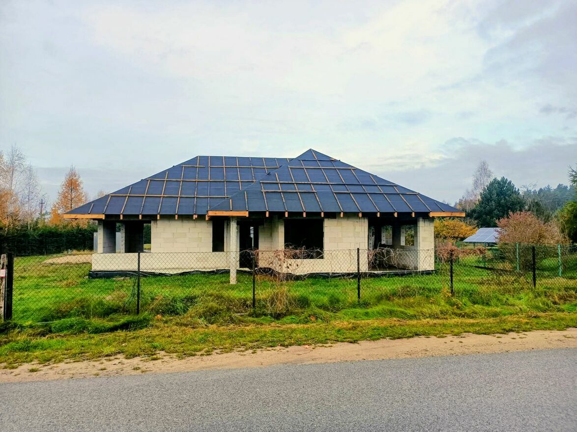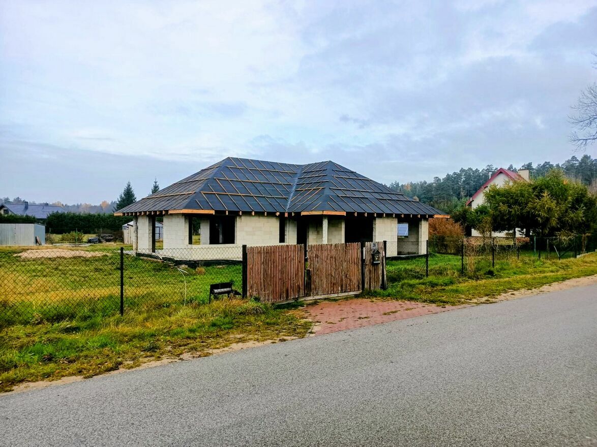 Działka niezarośnięta płaska, na działce rozpoczęta budowa budynku mieszkalnego.